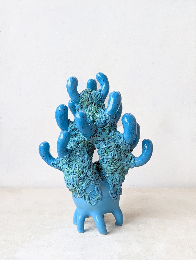 The earliest works in this series, created in ceramics, mark a starting point in my sculptural practice and opened the research I continue today. They emerge from a process of free associations, nourished by the random forms and elements that surround me in daily life. This intuitive gesture becomes a way to tame anxiety and transform the ordinary into fictional material.
