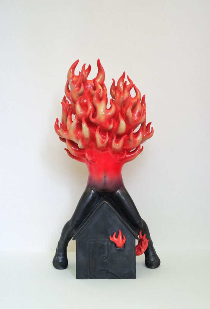 In these pieces, home and body coexist within a micro-universe of strange, overwhelming forms, echoing suicidal thoughts, the idea of death, and the impossibility of ever sharing time again with those who have left us. Tension permeates each work, between grounding and vertigo, familiarity and mystery, the lived and the elusive. They constitute a silent yet vibrant homage, a bridge between the visible and the invisible, between what no longer exists, what remains, and what is becoming. Human fragility, acts of remembrance, and the contained power of the extreme transform into sculptural matter, in suspended figures oscillating between unease, poetry, and strangeness.