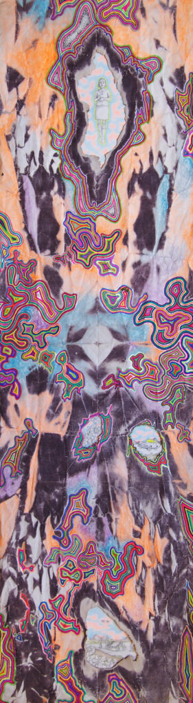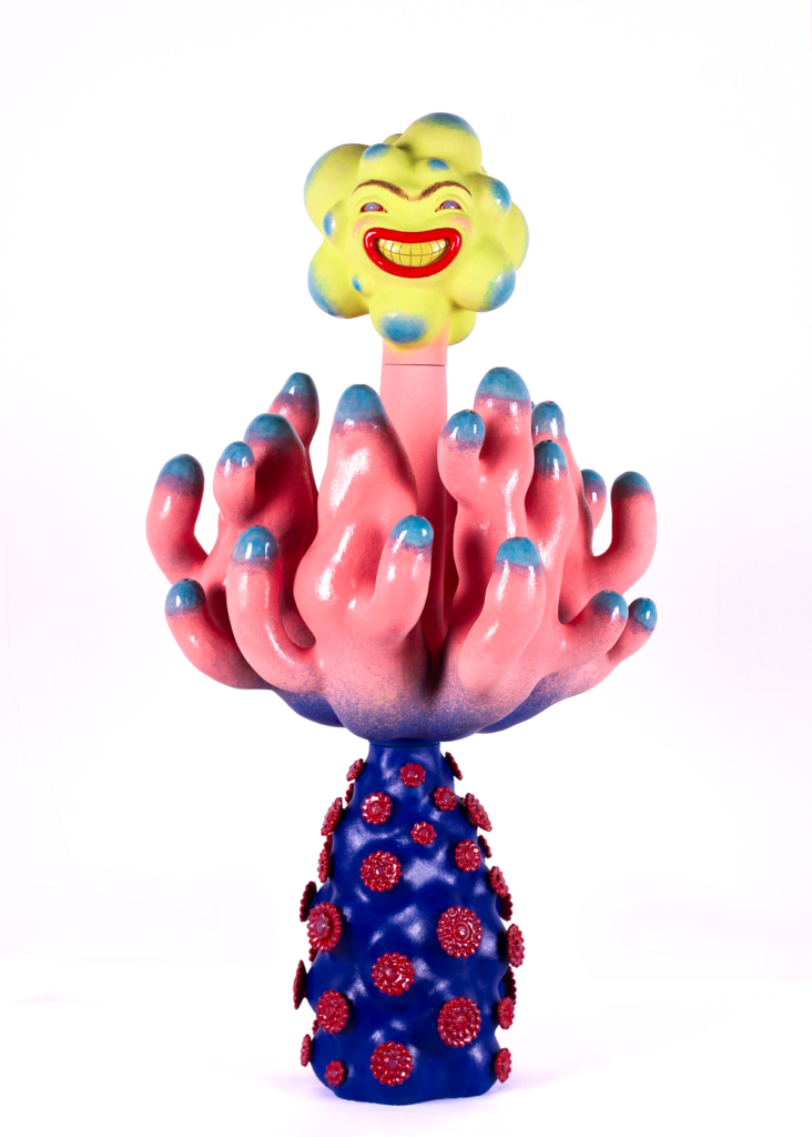 The idea of a fragmented, displaced, vulnerable being gradually nourished the singular universe in which I have since immersed myself. The term “ghost” resonates on multiple levels here. Doubling, not as disjunction but as multiplicity of the self, proved to be a home where I could embody various versions of myself. In this way, I found a way to liberate myself from myself, from this marginal body. Through my works, with organic forms and vibrant colors, I attempt to bring my ghosts to life and call them to gather. If we are to remain forever ghosts of ourselves, then let us honor them, as we honor our dead, with humor and a spirit of celebration, at least for today. Long live the ghosts!