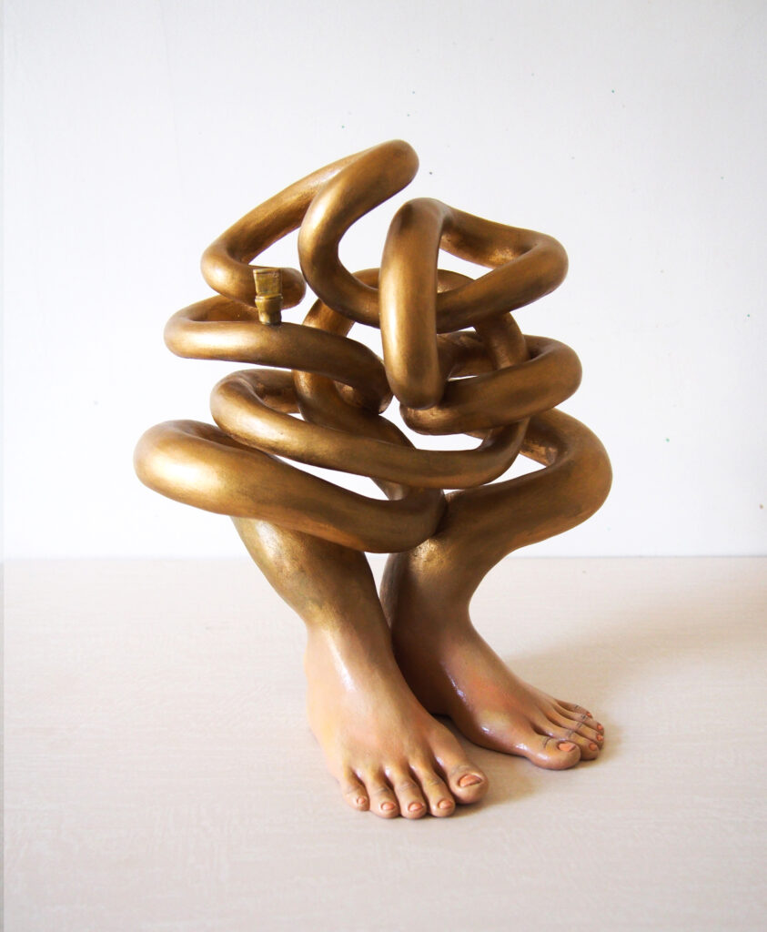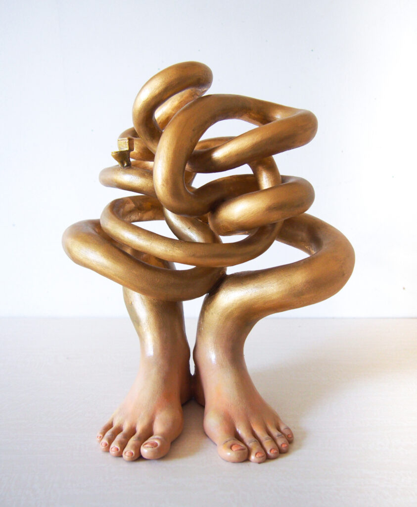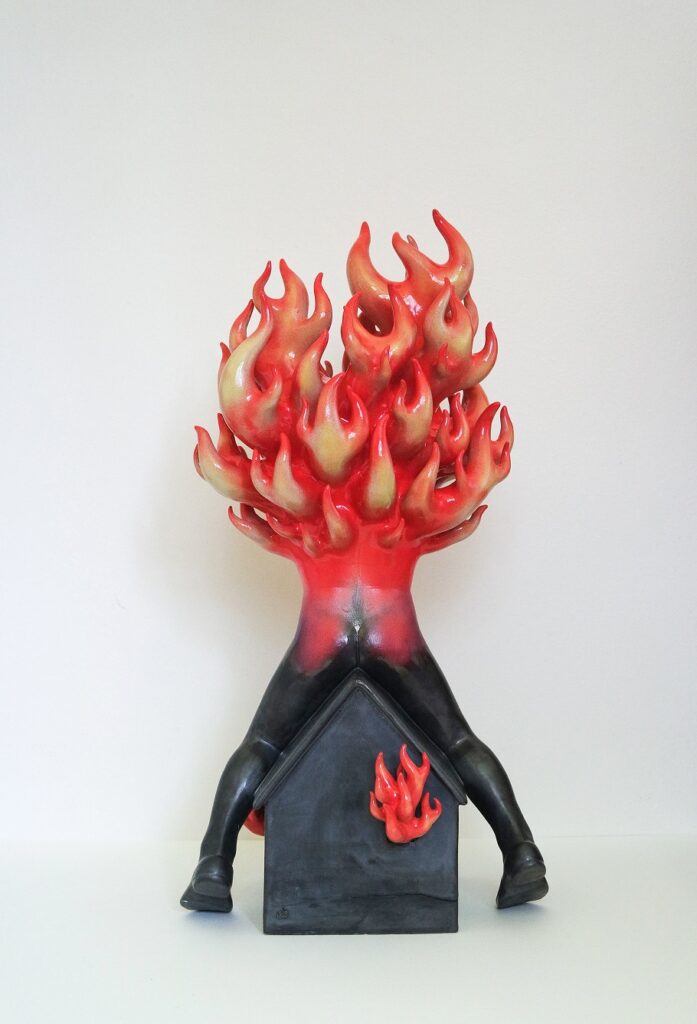 In these pieces, home and body coexist within a micro-universe of strange, overwhelming forms, echoing suicidal thoughts, the idea of death, and the impossibility of ever sharing time again with those who have left us. Tension permeates each work, between grounding and vertigo, familiarity and mystery, the lived and the elusive. They constitute a silent yet vibrant homage, a bridge between the visible and the invisible, between what no longer exists, what remains, and what is becoming. Human fragility, acts of remembrance, and the contained power of the extreme transform into sculptural matter, in suspended figures oscillating between unease, poetry, and strangeness.