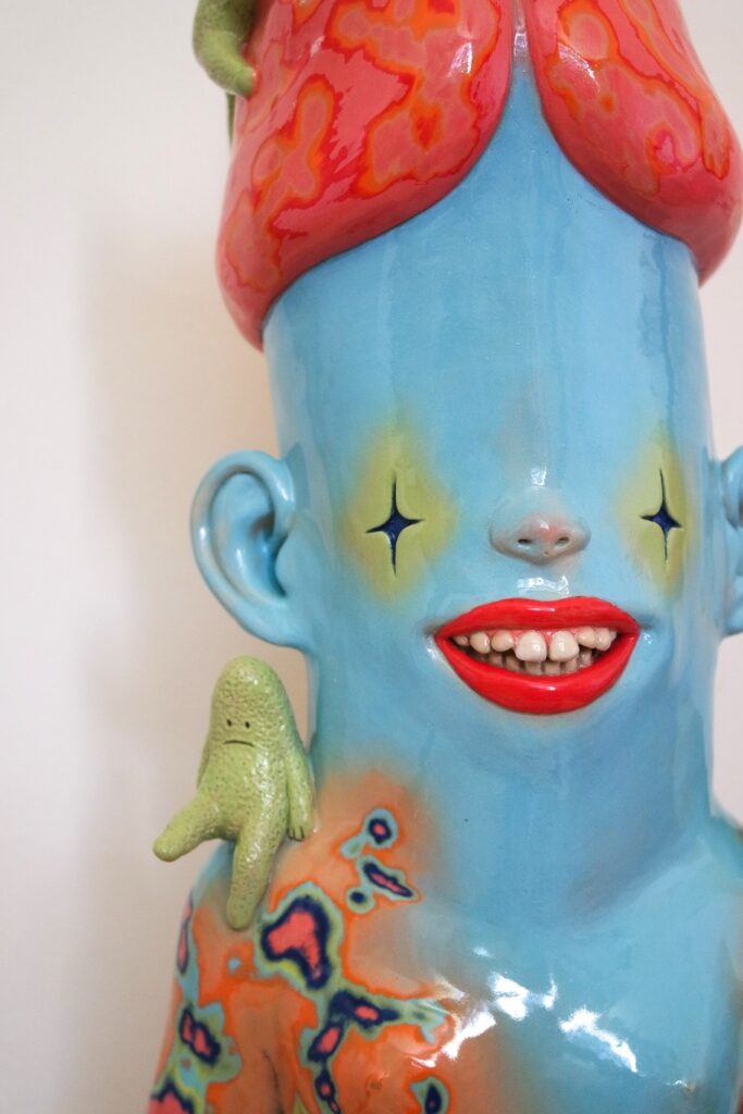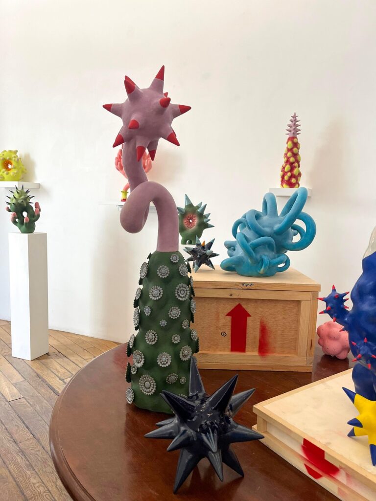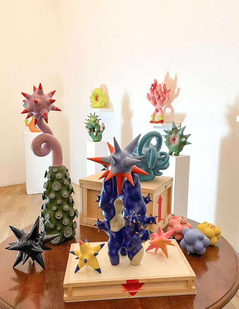 In the foreground: Lorenza, 2025, stoneware with engobe and glaze, variable dimensions
