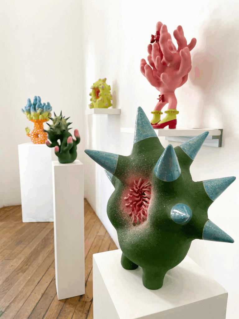Les coraux, bien que fixés au fond marin, semblent paradoxalement ancrés dans un environnement en perpétuel mouvement. Organismes vivants formant leur propre architecture, ils sont à la fois structure et abri, corps et maison. Cette immobilité, évoquée par la matière céramique et la condition statique des sculptures, nous confronte à l’angoisse du possible, à la liberté et au hasard, tout en nous invitant à une forme d’acceptation lucide face à ce qui nous dépasse.