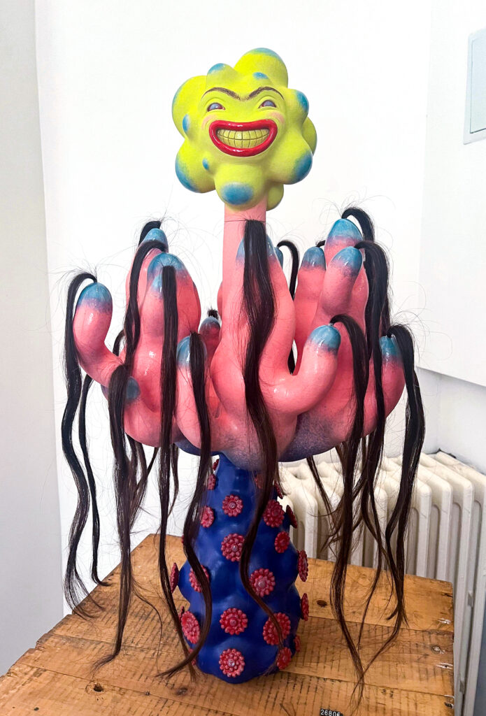 Floctopuss, 2025, stoneware with engobe, glaze and human hair,
